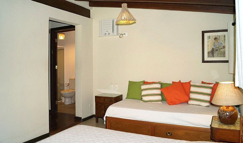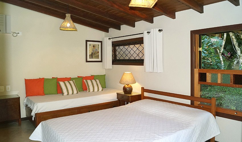 Uma suite extremamente acolhedora que irá proporcionar a você uma inesquecível estadia em Ilhabela. Ar condicionado - Cama de casal - Cama de solteiro - TV 32" Led, Sky livre - Banheiro privativo com box - Frigobar - WiFi.